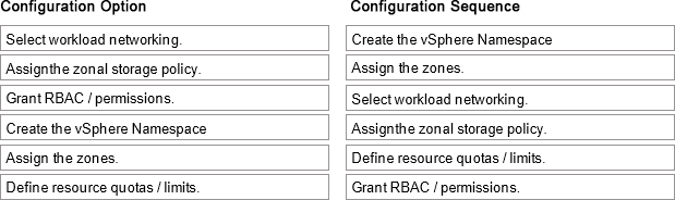 With zones set, you configure workload networking, because namespaces must have the correct network attachment and IP behavior for the workloads that will be placed across the selected zones. Then you assign the zonal storage policy, ensuring that persistent volumes can be provisioned using storage that is valid /available for the zone placement model you selected. After networking and storage access are defined, you set resource quotas/limits (CPU, memory, storage) so multi-tenant consumption stays within governance boundaries. Finally, you grant RBAC/permissions so the right DevOps/users can consume the namespace and provision clusters/workloads under the enforced controls.