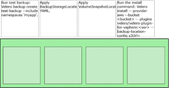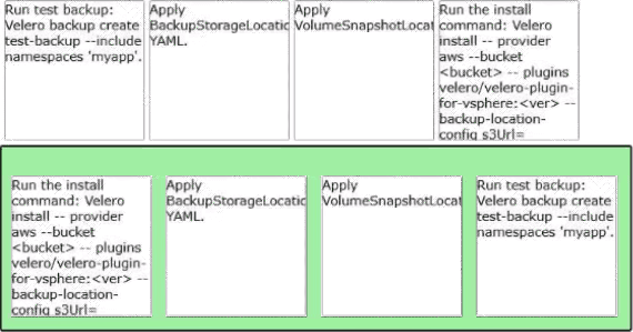4.A VMware Administrator is tasked with implementing a backup and restore strategy using Velero and external object storage for the namespace ‘myapp1. Arrange the steps In the correct order of operations to enable Vetero.